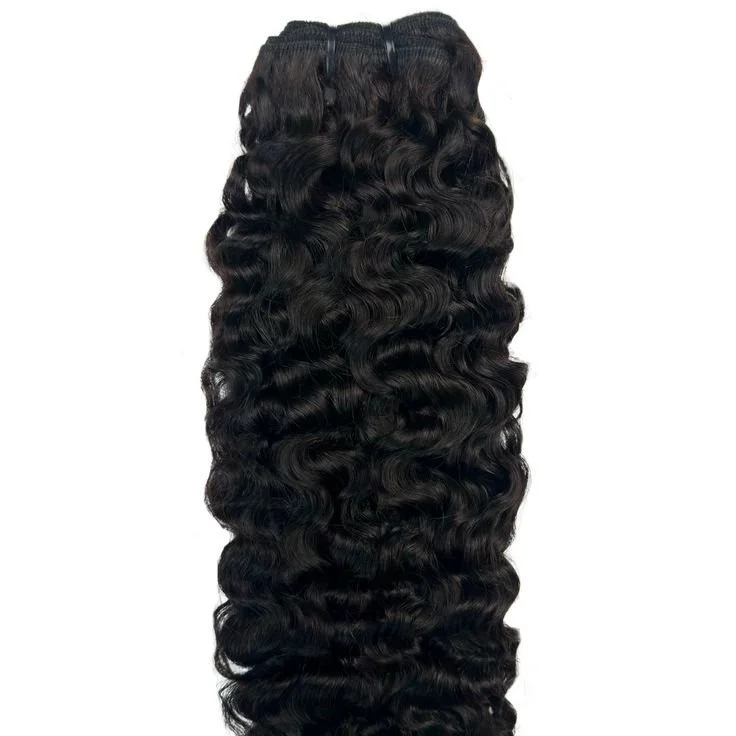 The hair is naturally curly with a distinct, tight curl pattern. It has a lot of volume, and the curls range from loose ringlets to tighter, more defined spirals, offering a lot of versatility when styling. The hair is typically thick and full, providing a lot of body and bounce. It is not too heavy but has enough volume to maintain its shape even after washing and styling.